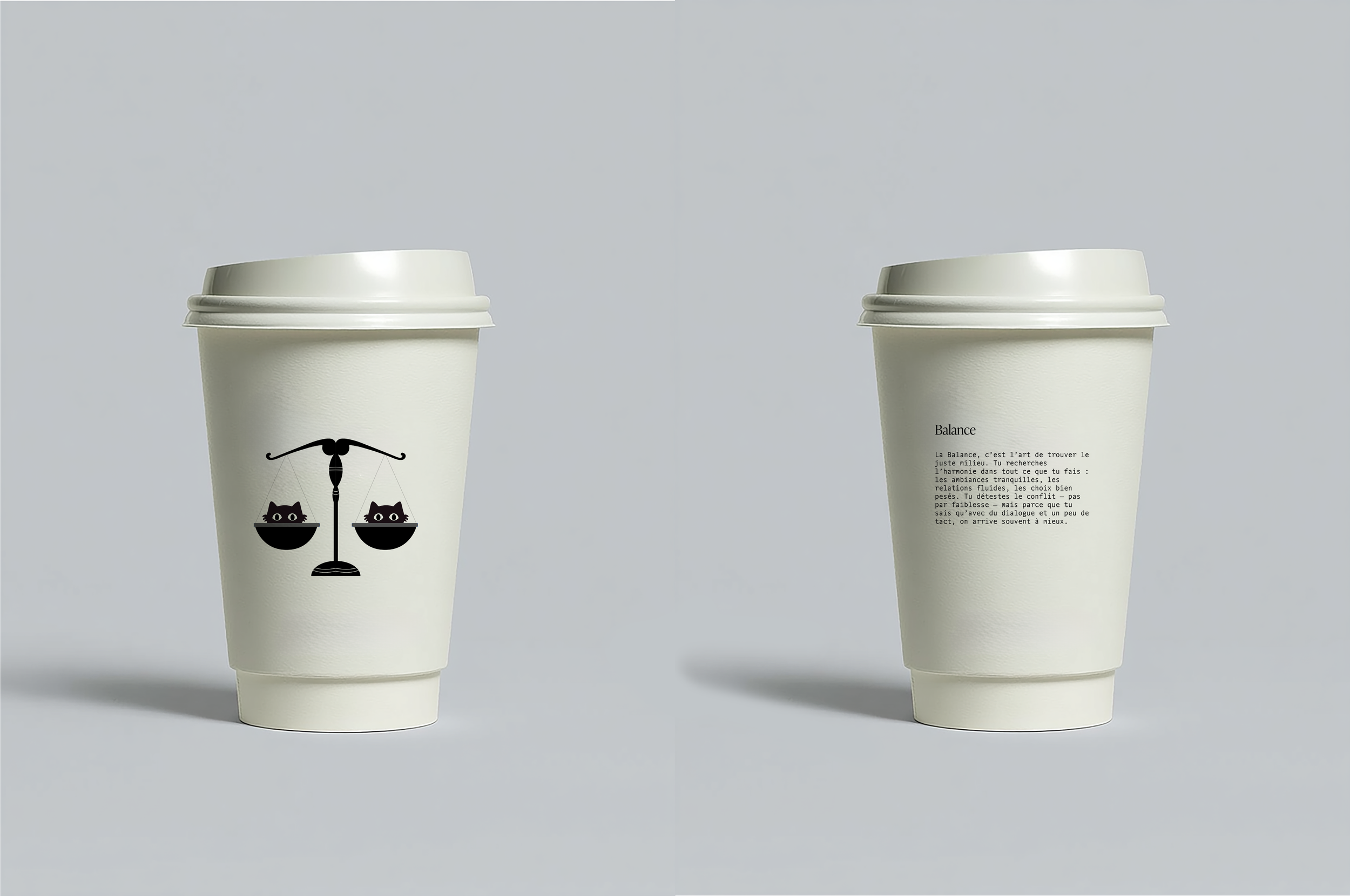 Dans cette direction artistique, j’ai voulu explorer la dualité du mystique : la part d’ombre (la lune, mystérieuse et introspective) et la part de lumière (le soleil, symbole de chaleur et d’éveil) à la fois pour l’identité visuelle, le site, la communication et le packaging des cups.